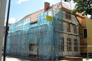Die Fassade des Gebäudes sollte saniert werden, wobei Teile des Putzes erneuert werden mussten und umfangreiche Sandsteinrestaurierungsarbeiten im Sockelbereich stattfanden. Das Fachwerk im Obergeschoss war ursprünglich verputzt und die Fachwerkstruktur lässt erkennen, dass es aus zwei niedergelegten Fachwerkhäusern aufgebaut wurde. Deshalb wurde eine zurückhaltend graue Farbgebung gewählt. Im Saal im Erdgeschoss und im Kellerabgang wurden Feuchteschäden im Sockelbereich saniert.